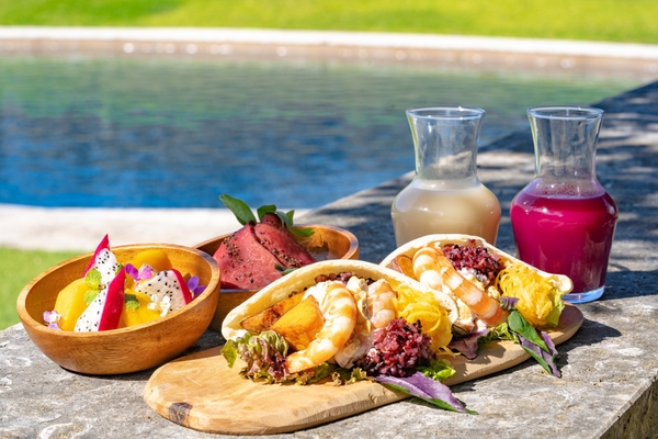 2日目の朝食には、「ガジュマルブレックファスト」を提供します。施設の中央に位置するプール近くのガジュマルテラスで、ゆったりと朝食の時間を過ごします。提供するのは、ピタパンを使用したサンドイッチと2種のジュースです。食物繊維豊富な黒紫米やサワークラウトを使用したサンドイッチ、御神酒をアレンジした沖縄の発酵飲料であるミシャク、ドランゴンフルーツと紅芋をヨーグルトに合わせたジュースを味わいます。大きなガジュマルの木が作る木陰のテラスで、沖縄に親しみのある食材を使用した朝食を楽しみます。