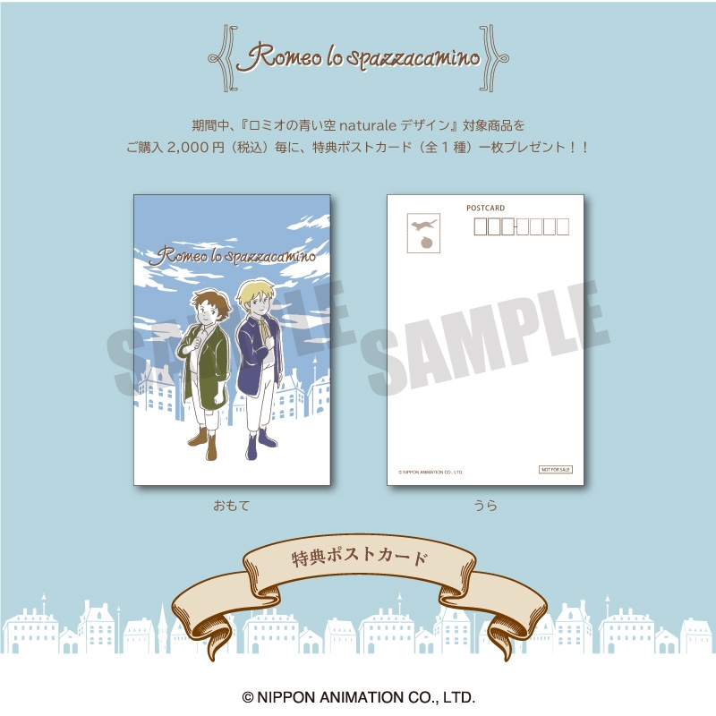 期間中、Naturale(ナチュラーレ)デザイン関連商品を税込2,000円以上お買い上げ毎に、限定ポストカード(Naturaleデザイン)をを、「ロミオの青い空」×プレイピーシリーズの関連商品を税込2,000円以上お買い上げ毎に、限定ポストカード(プレイピーデザイン)を1枚プレゼントいたします。
