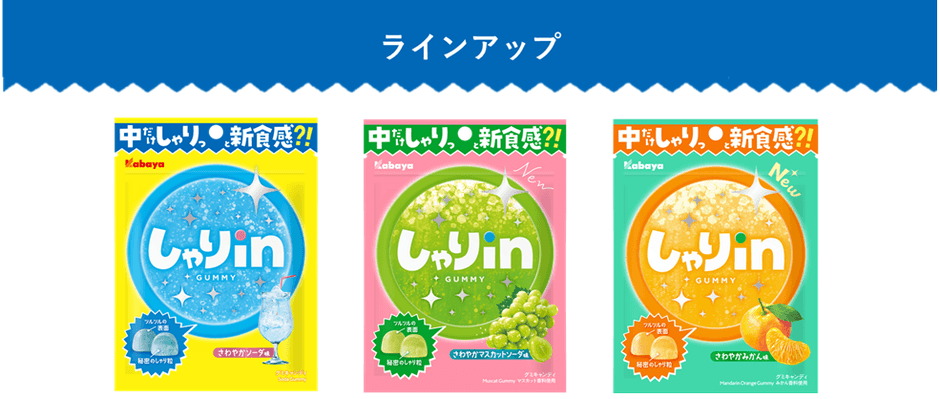 『しゃりinグミ みかん』の発売により、『しゃりinグミ』ブランドは、「ソーダ・マスカット・みかん」の3種類のフレーバーラインアップになります。※3
