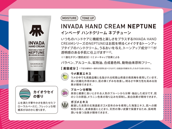 宇宙をテーマにしたハンドケアブランド「INVADA」は、その名の由来となるInvader(侵略者)が侵略していくかのように、商品に包含した美容成分が肌に浸透し、効果を発揮していくというメッセージを込めており、オリジナルキャラクターの “インベーダ” は、ハンドケアプロダクトのシンボルマークに相応しく「手の形」をモチーフにした宇宙生命体として、さまざまな商品のアイコンとなるように開発されています。
