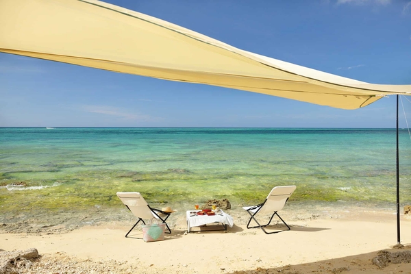 足元に寄せる波に触れながらティータイムを楽しめるように、波打ち際にビーチチェアとテーブルをしつらえた、特別席を用意します。日よけのタープも設置するため、日差しを気にせず快適に過ごせます。専属の星のや沖縄スタッフが居心地のよい空間となるよう気を配り、波風の変化にも柔軟に対応するため安心です。足元が波に包まれると、まるで海上にいるような気分を味わえます。
