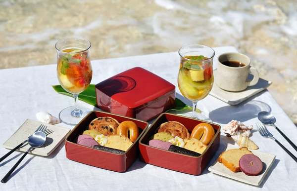 スイーツには、沖縄で親しまれる食材を使用した、焼き菓子を用意します。5、6種類の色鮮やかなスイーツを箱に詰めて、ピクニックスタイルで提供します。ドリンクは、トロピカルフルーツがたっぷり入った冷たいフルーツティーを含む、数種類からセレクトが可能です。滞在中は専属の星のや沖縄スタッフがサービスにあたり、オーダーごとにドリンクを提供します。美しい自然環境の中で、贅沢な午後のひとときを過ごせます。