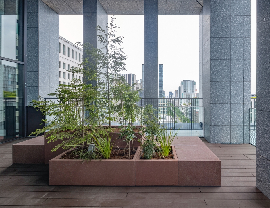 高層階のVOID空間内の一部は、建物内でも光や風、緑が感じられるリフレッシュスペースとしました。高性能外皮による熱負荷の低減や昼光センサーによる調光制御、高効率のコージェネレーションシステムによる排熱利用などを通じて、建物全体で省エネルギー化を実現します。