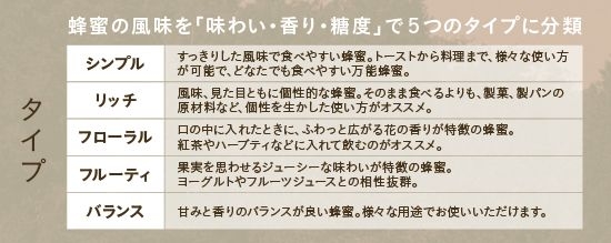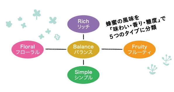ハニクルでは、いろいろな花から採れる蜂蜜を「味わい・香り・糖度」により分類し、5つのタイプで表現しています。