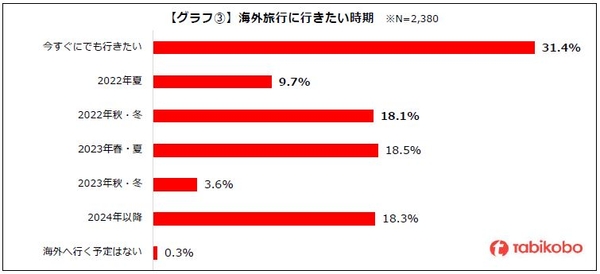 また、年内に行きたいという方(「今すぐにでも行きたい(31.4%)」「2022年夏(9.7%)」「2022年秋・冬(18.1%)」)は59.2%となっており、約6割の方が年内に海外旅行に行きたいと回答しています。※グラフ③参照