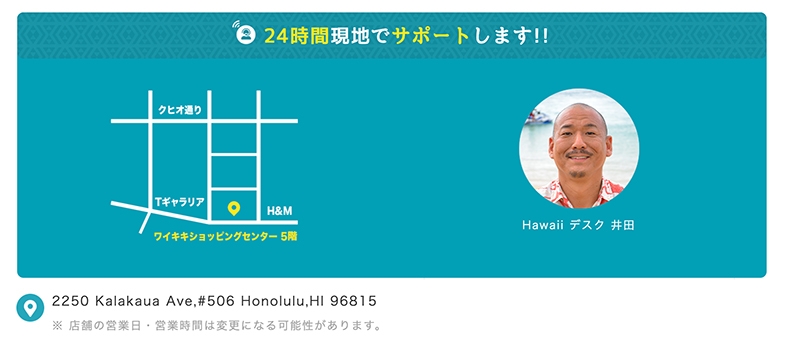 ・現地サポート(24時間日本語対応。旅工房ハワイ支店・アロハセブンがトラブルやご相談事に