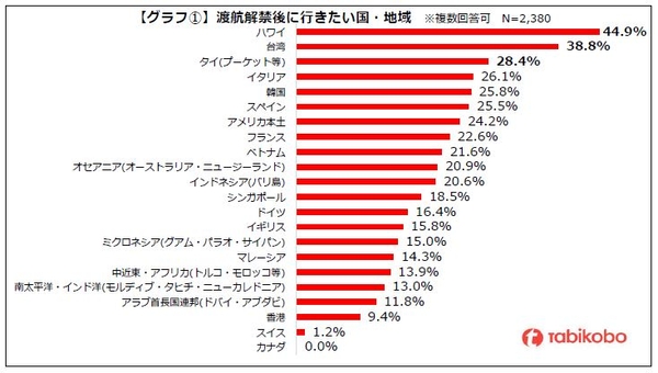 渡航解禁後に行きたい国NO.1はハワイ。続いて、台湾・タイが人気となっている。
