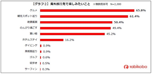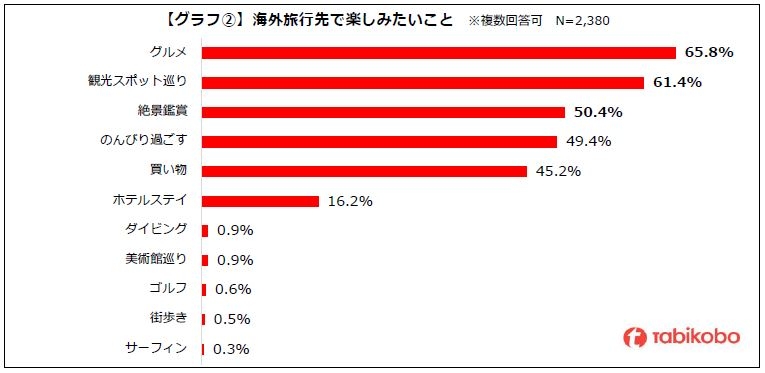 海外旅行では何を楽しみたいかという質問では、「グルメ」が65.8%と最も多く、次いで「観光スポット巡り」が61.4%、「絶景鑑賞」が50.4%となっています。※グラフ②参照