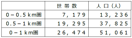 ・店舗から1㎞圏内は単身世帯比率が48.6%、2人世帯比率が25.1%と全体の7割が少人数世帯です。