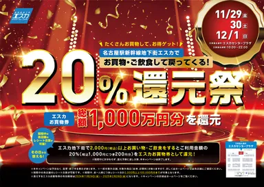 総額1,000万円を還元!買えば買うほどお得な3日間 11/29~12/1開催、名古屋駅地下街エスカ「20%還元祭」