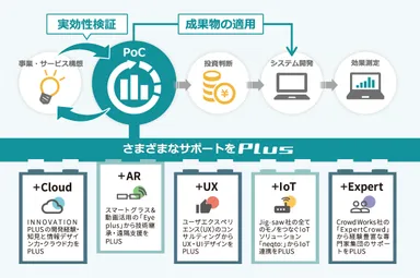 社会や顧客の妄想と課題を聞き取り、ビジョンに落とし込み、理想と現実とのギャップを埋める戦略と実現のために“デザイン思考”を用いて具現化し、自社のプラットフォーム事業である「Innovation Platform」を提供し、ビジネスを”共創“・”伴走“します。