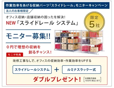 オフィス・店舗収納の“困った”はスライド収納で解決! 「スライドレールシステム」+「ルミナスラック」一式進呈 法人を対象にした無料モニター募集を開始