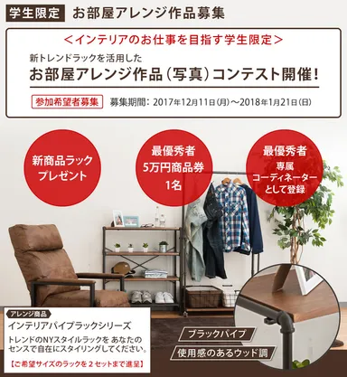 【学生限定】インテリアのお仕事を目指す方対象 新トレンドラックを活用した 「お部屋アレンジコンテスト」開催! 最優秀者に5万円分商品券 +専属コーディネーターに登録契約