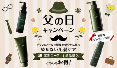 さわやかお父さんへの第一歩!! 紫外線等によるダメージをケアして清潔感のある頭皮・毛髪へ 健やかな頭皮に導くポリフェノール 【ジカフェオイルキナ酸】を新配合した 【SUNA BIOSHOTスカルプエッセンスプレミアムシリーズ】の 父の日キャンペーンを実施中。 ポータブルエチケットセットをプレゼント