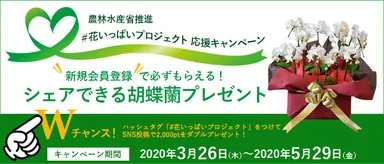花いっぱいプロジェクト応援キャンペーン 新規会員登録で 「幸せのおすそわけ・シェアタイプ胡蝶蘭」プレゼント実施中!