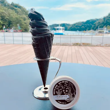 イカスミが甘さを引き立てる。 イカの駅つくモールから大人気イカスミソフトクリームが アイスになって新登場