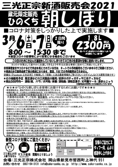 岡山県新見市 三光正宗 新酒販売会を3月6・7日に 酒蔵で開催 販売会場限定酒「ひのくち朝しぼり」を 期間限定でネットでも販売