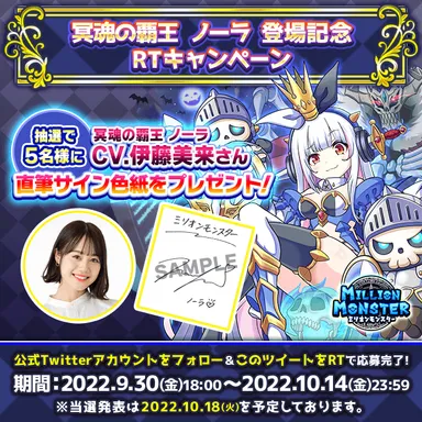 スマホRPG「ミリオンモンスター」で声優「伊藤美来」さんの 直筆サイン色紙プレゼントキャンペーンを9月30日より開催!