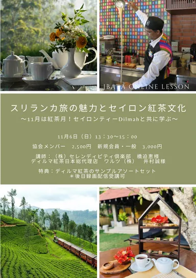 ~11月は紅茶月!セイロンティーDilmahと共に学ぶ~ オンラインレッスン「スリランカ旅の魅力とセイロン紅茶文化」 11月6日(日)/13時30分~15時
