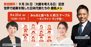 世界で結果を残した日本代表たちの勝負メシ! 第3回「みんなと食べる!大腸活テーブル」参加者募集