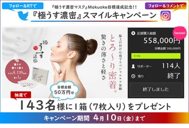 新型コロナウィルス対策でストレスを感じている女性を 応援するため、クラウドファンディングで集まった 支援分のシートマスクを還元する 「『極うす濃密』スマイルキャンペーン」を実施