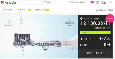 クラウドファンディング「Makuake」にて目標の2,400%突破! 音波振動式ソーラー歯ブラシで1,200万円の資金調達を達成