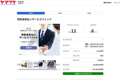 ヤマワケ 投資・配当型クラウドファンディング 『売掛金前払いサービスファンド』! 募集額3,000万円を大きく上回る2億3,165万円(達成率772%)の 申込により、満額で成立しました