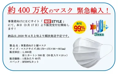 マスクの緊急輸入及び事業者向け販売に関するお知らせ