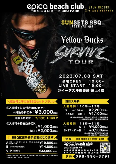 沖縄イーアス豊崎【epica BBQ beach club】にて BBQ音楽フェスティバル「epica SUNSET BBQ FES vol.6」 ¥ellow Bucks『SURVIVE TOUR』を 2023年7月8日(土)に開催!