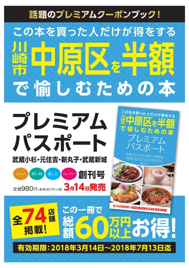 川崎市中原区の74店舗掲載!総額60万円以上お得なクーポン 「プレミアムパスポート~武蔵小杉・元住吉・新丸子・武蔵新城~」 創刊