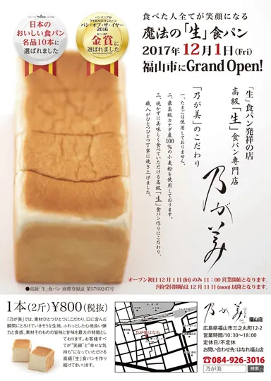 “パン・オブ・ザ・イヤー”金賞の高級「生」食パン専門店 『乃が美 はなれ 尾道販売店』が11月17日(土)オープン