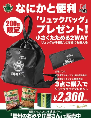 最終節のおみやげは、“松本山雅FCバウム&ポテトチップ” 12/7のサンプロ アルウィンでは、200セット限定で 「松本山雅FCエンブレム入りリュックバッグ付セット」を販売