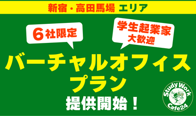 【6社限定・新宿/高田馬場エリア】バーチャルオフィスプラン提供開始!「StudyWork Cafe24 高田馬場店」