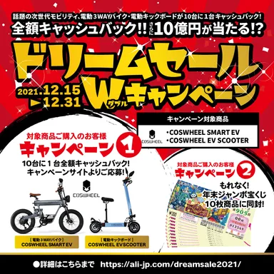 次世代型モビリティCOSWHEEL 電動キックボード・電動バイクの2車種対象 歳末に『ドリームセール!Wキャンペーン』を12月15日から開催! さらに年末ジャンボ10億円が当たる!?