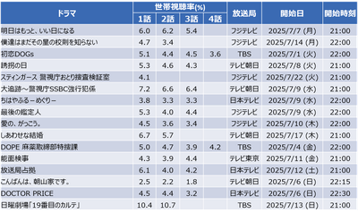 【速報】2025年夏ドラマの視聴率を分析 松本潤主演「19番目のカルテ」が盤石の強さ