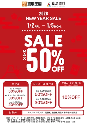 【2026 NEW YEAR SALE】 最大50%OFF開催!買取王国・良品買館では、お手頃価格のリユース品が更にSALE価格でお買い求めできる2026 NEW YEAR SALEを1月2日から店舗限定で開催いたします。