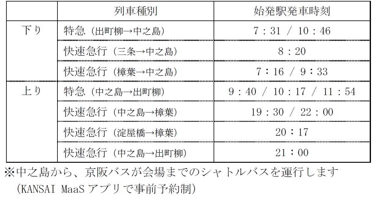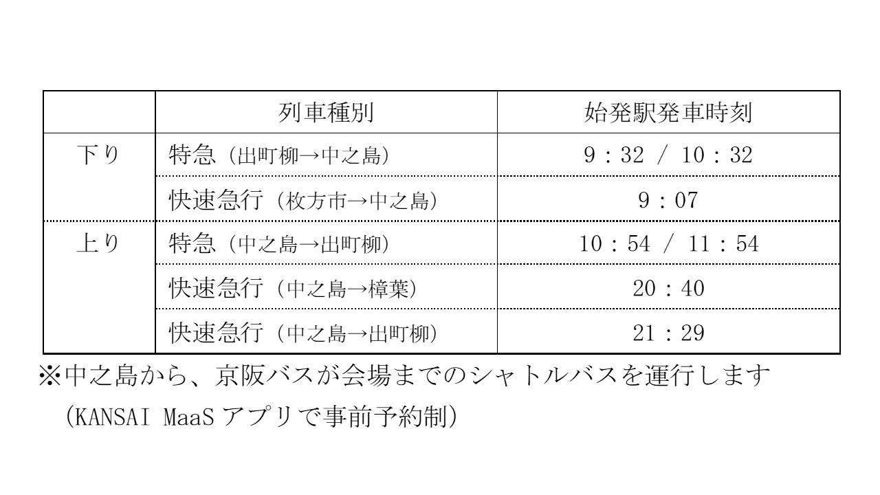 加えて、大阪・関西万博の開催期間中には、臨時列車として中之島駅発着の「特急」「快速急行」を設定し、京阪バスが運行する会場へのシャトルバス(事前予約制)が発着する中之島駅への利便性向上を図ります。