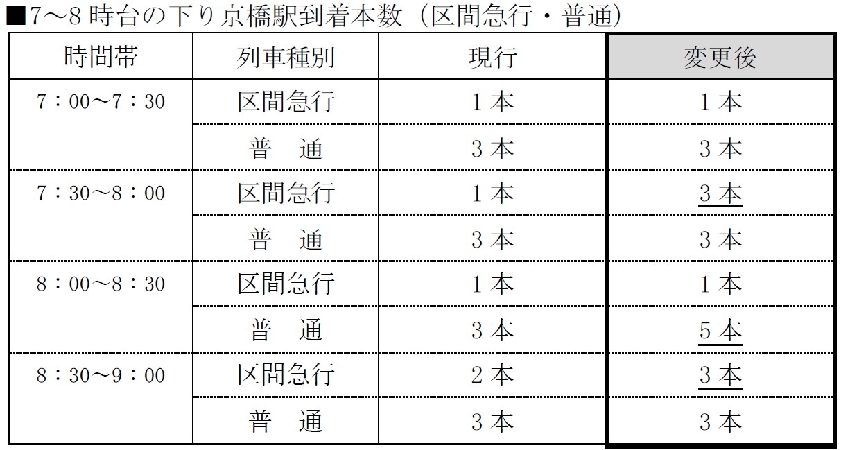 ・7~8時台下り(大阪方面行き)について、混雑緩和のため「区間急行」・「普通」の合計5本(京橋駅到着本数)を増発します。