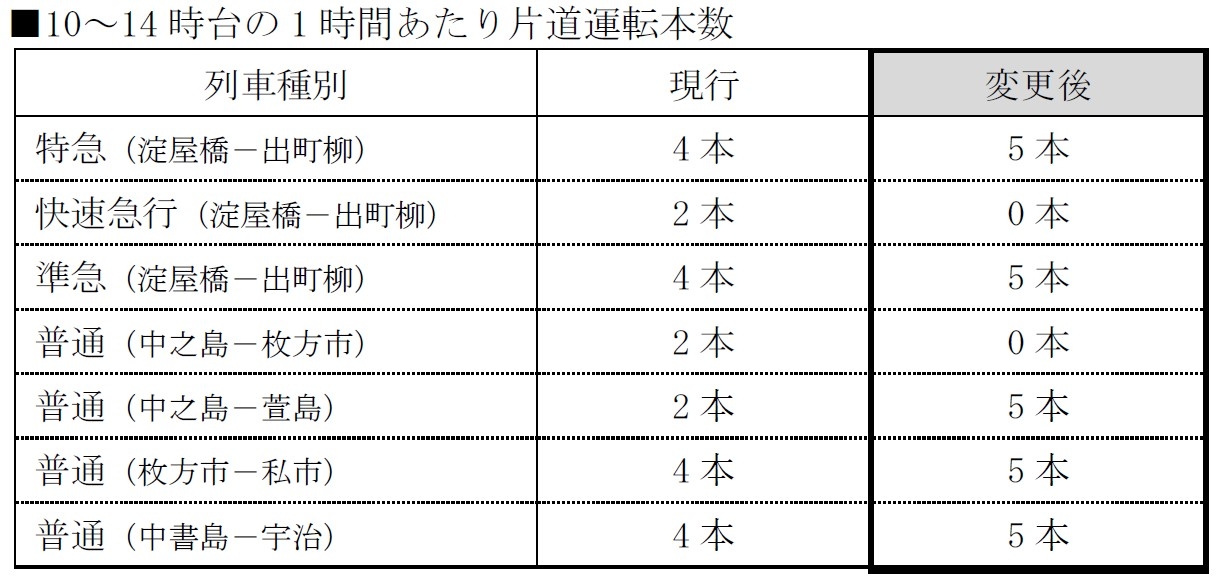 今回のダイヤ変更では、昼間時間帯の運転パターンについて、各列車種別を約 12分間隔(現在は15分間隔)に変更し、お客さまの利便性向上を図ります。淀屋橋・中之島~萱島間において、昼間・夜間時間帯はご利用状況に鑑み、「普通」について4両編成を主体とした運転とします。朝夕ラッシュ時にも一部列車を除き「区間急行」「普通」を4両編成で運転し、一方で、輸送力確保や混雑緩和を図るため増発します。 また、主に京都方面での大学生の通学時間帯における混雑緩和のため、出町柳駅発着の列車を増発します。