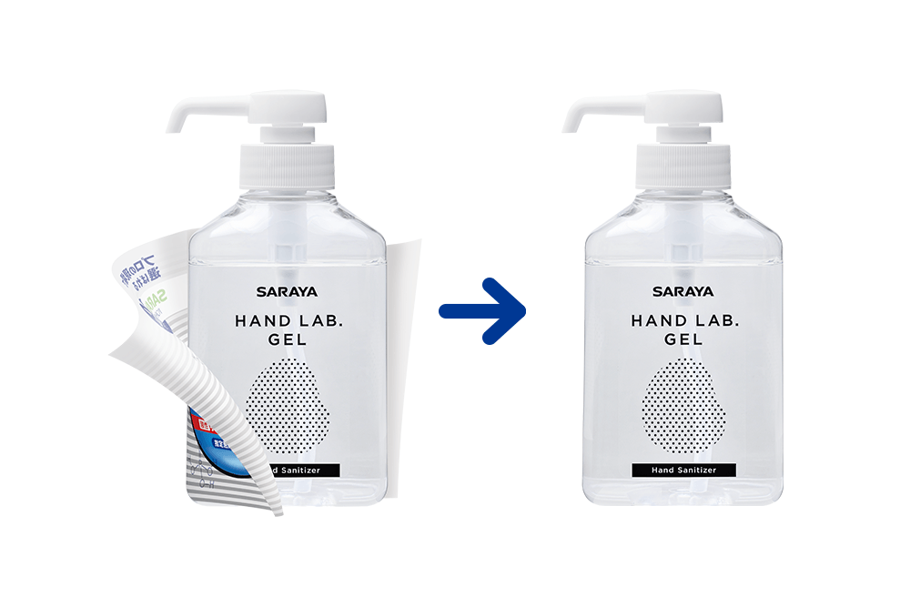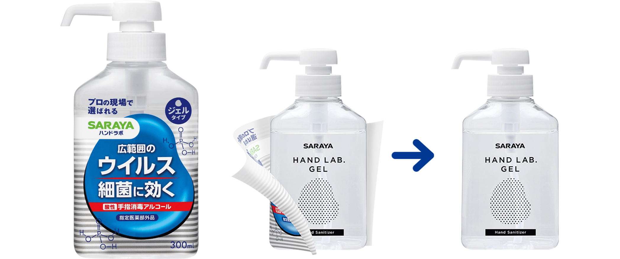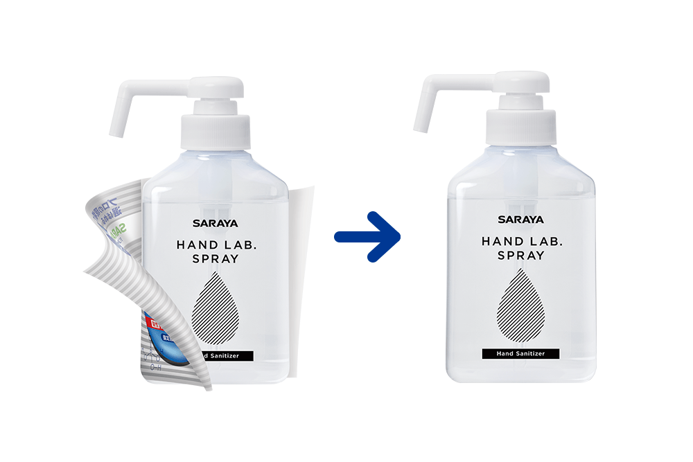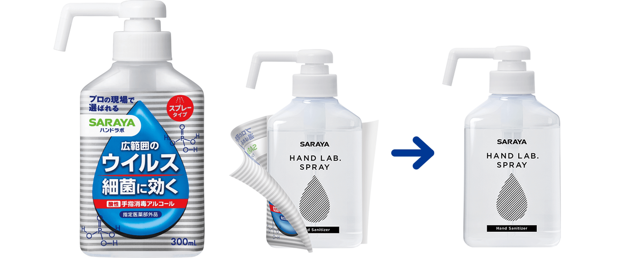 プロの現場で選ばれるサラヤの手指消毒シリーズがリニューアル 商品ラベルをはがすと、“シンプルボトル”に変身!! 『SARAYAハンドラボ 手指消毒スプレー・ハンドジェル』 2019年9月2日(月)よりリニューアル発売開始