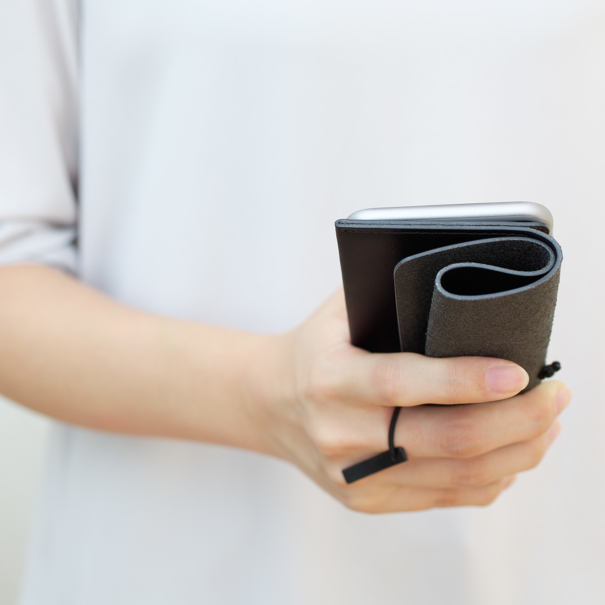 柔軟に曲げられる一枚革なので、丸めてグリップにしたり、スタンドとして使ったり、いろいろな持ち方や使い方ができます。ケースを閉じるためのゴムひもは、画面を操作する際に指を通すことで落下を防止し、片手でも安心して持つことができます。