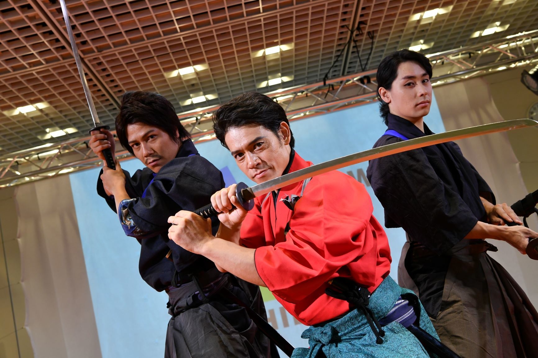 俳優、東 武志が子供から大人まで盛り上げる殺陣パフォーマンスを披露。