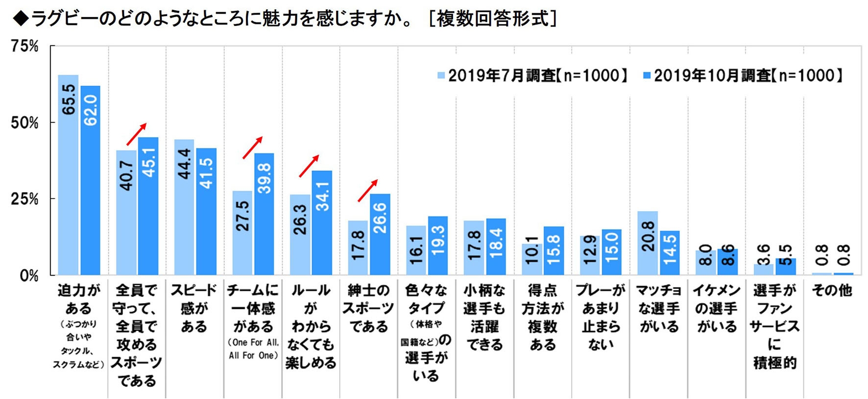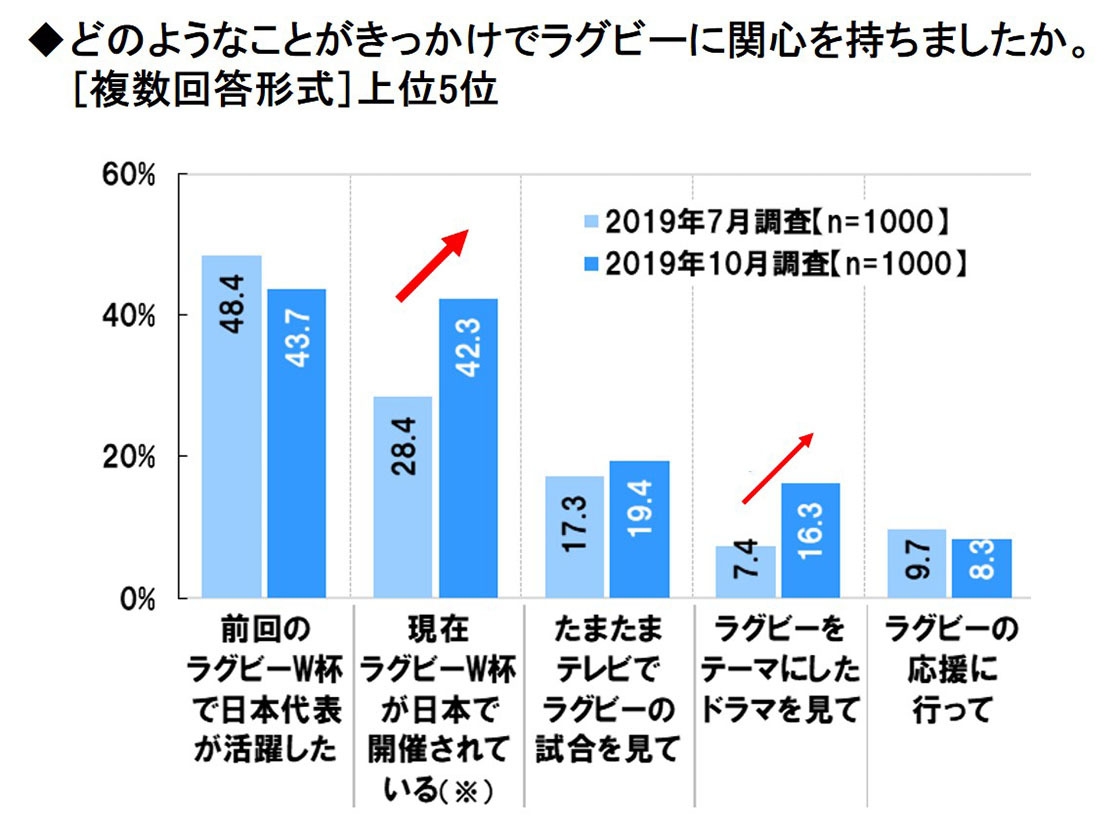また、関心を持ったきっかけを聞いたところ、「現在ラグビーW杯が日本で開催されている」と回答した人が42.3%と、前回調査に比べ14ポイントも上昇。「ラグビーをテーマにしたドラマを見て」も10ポイント以上アップ、「たまたまテレビでラグビーの試合を見て」も微増しており、ラグビーW杯は、多くの人にとって「過去の記憶の延長」ではなく「今ゴト」として捉えてれているようです。
