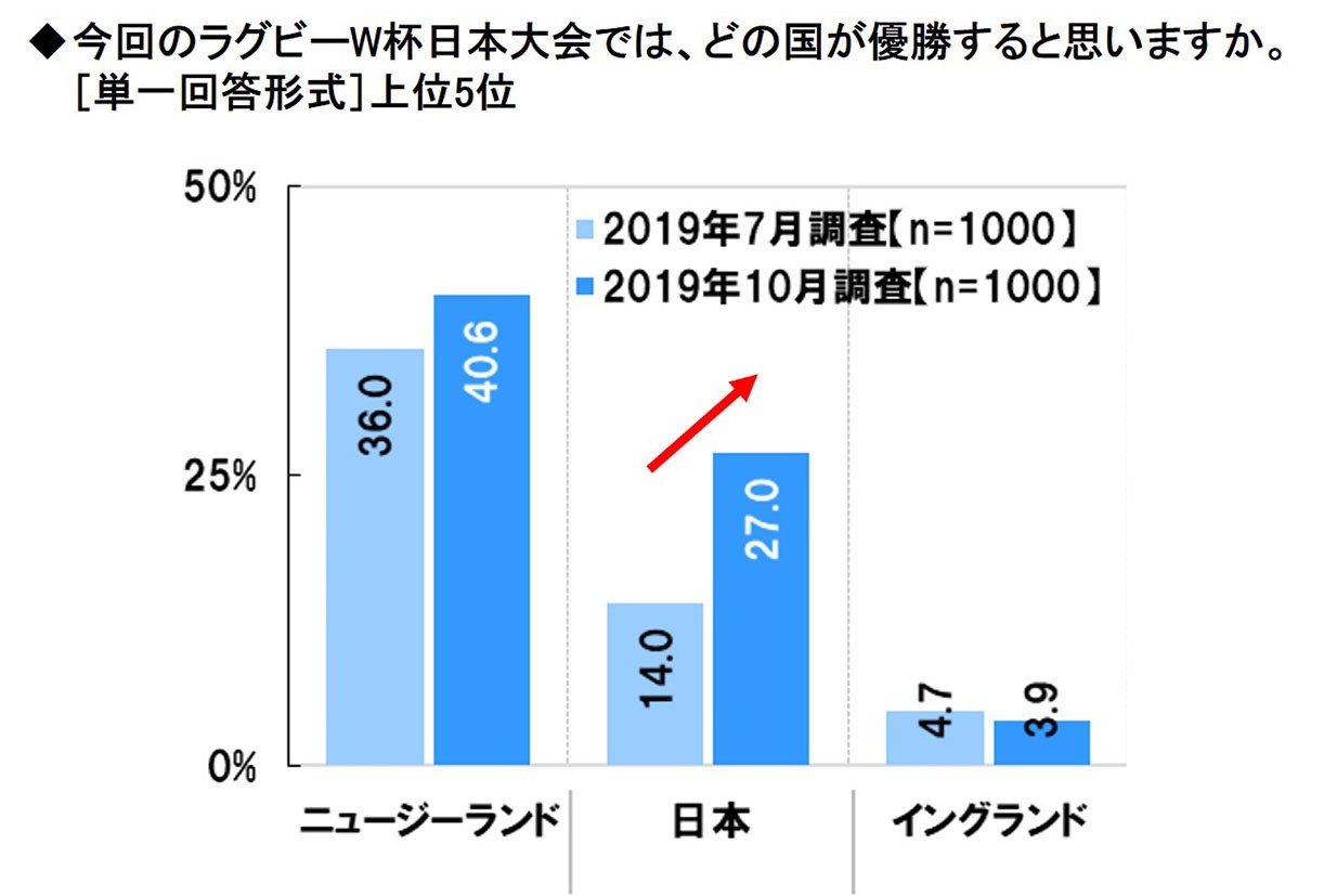 今回のW杯での優勝国を聞いたところ、1位、2位は前回同様ですが、数値が大きく変動。第1位の「ニュージーランド」は前比約4ポイント上昇し、不動の予想ですが、2位の「日本」が前比13ポイント上昇で、27%の人が優勝と予想。相次ぐ強豪撃破で、日本チームの優勝への期待が大きく高まっています。