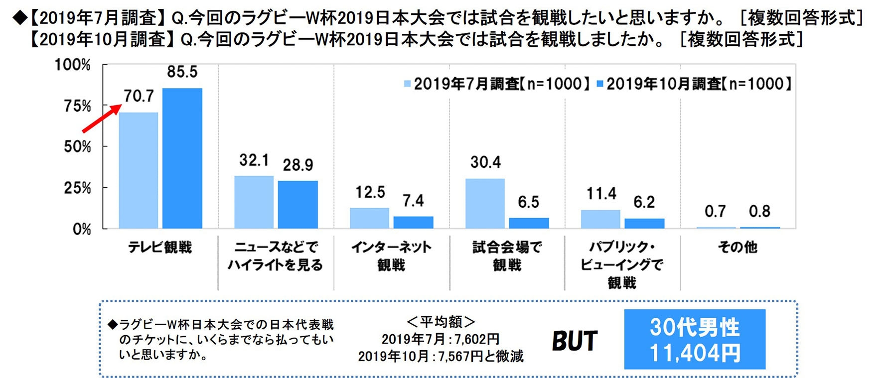 ラグビーの観戦方法は、「テレビ」がトップで85.5%の人が回答。前売チケット販売中だった前回の調査に比べて、会場で観戦は減少しているものの、ニュースなどでの事後観戦も減少しており、多くの人がライブ観戦をしているようです。