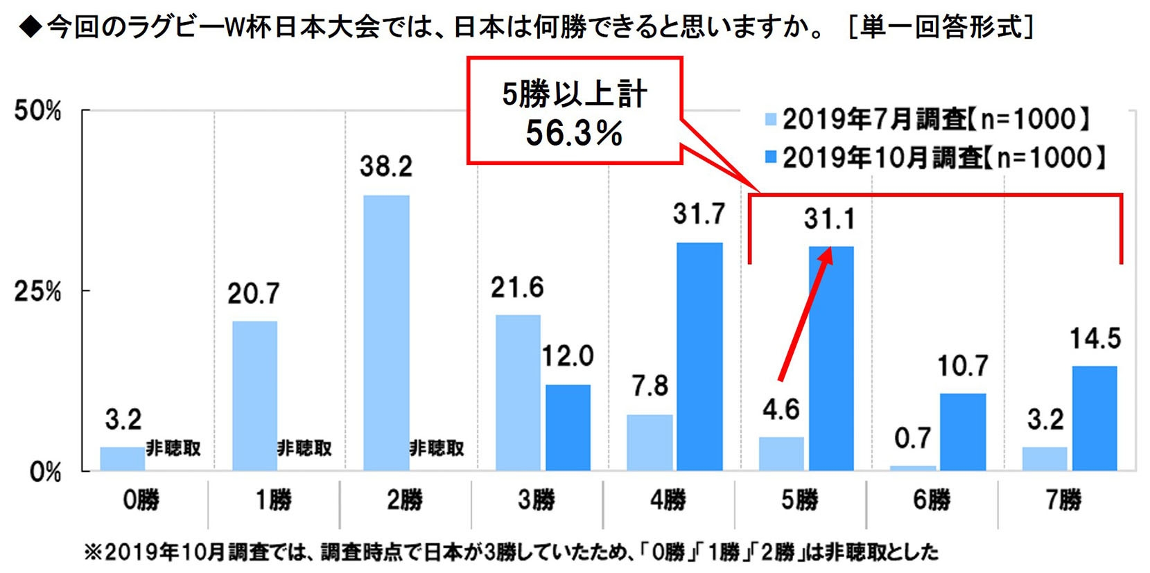 また、日本の勝利数予測も、大きく変化。過半数が5勝以上勝つ、と予想しており、決勝トーナメントでの勝利を確信している人が非常に多くなっています。