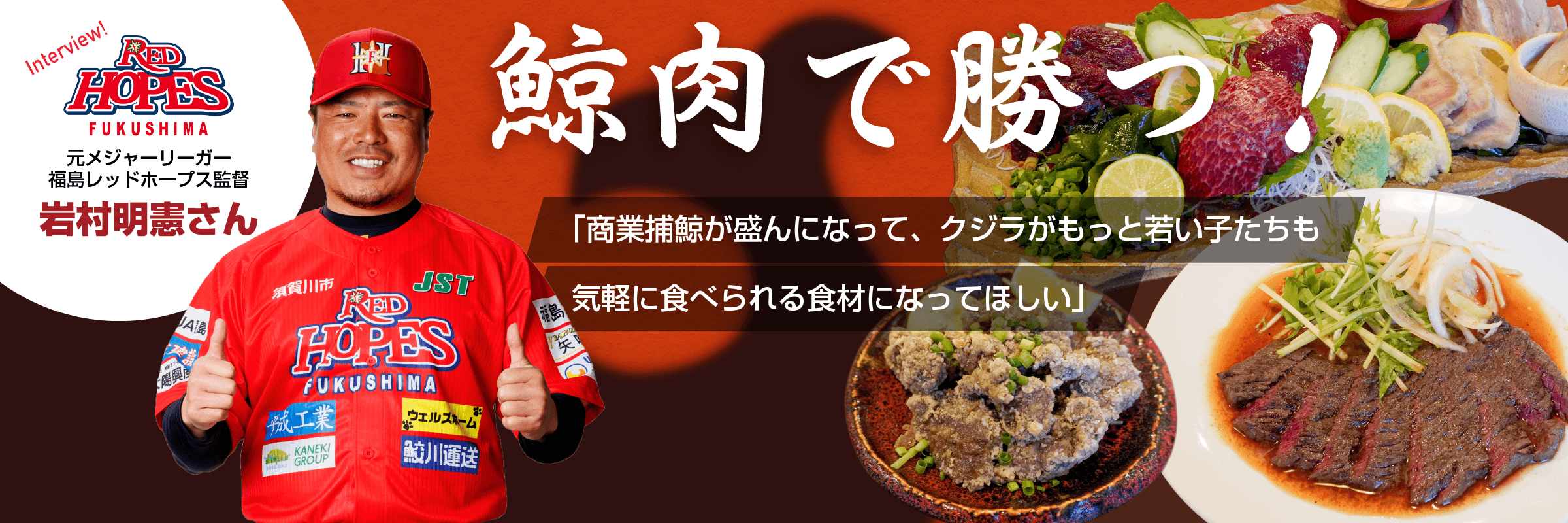 くじらタウン、アスリートインタビュー第4弾! くじら肉の新たな魅力を発見! 若い世代にも気軽な食材になって欲しい 元メジャーリーガー・福島レッドホープス監督の 岩村明憲氏が登場