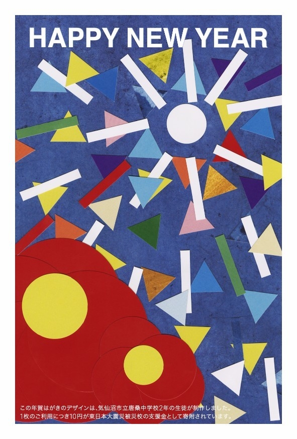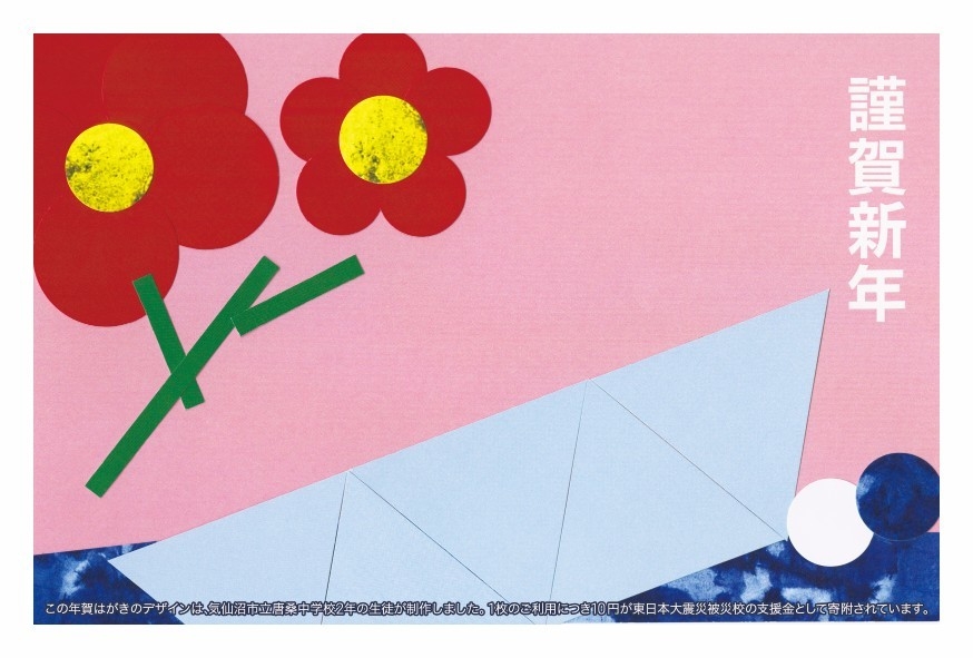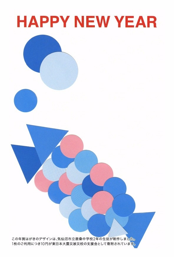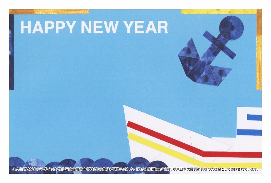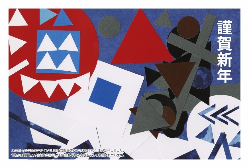 作品は、同校の2年生が、○△□の単純な図形の組み合わせで年賀はがきのデザインを制作したものです。「気仙沼について、全国の人に知って欲しいこと」をテーマに、生徒たちが伝えたいと思う「気仙沼の魅力」が表現されており、海の幸や自然など気仙沼ならではの魅力がつまっています。