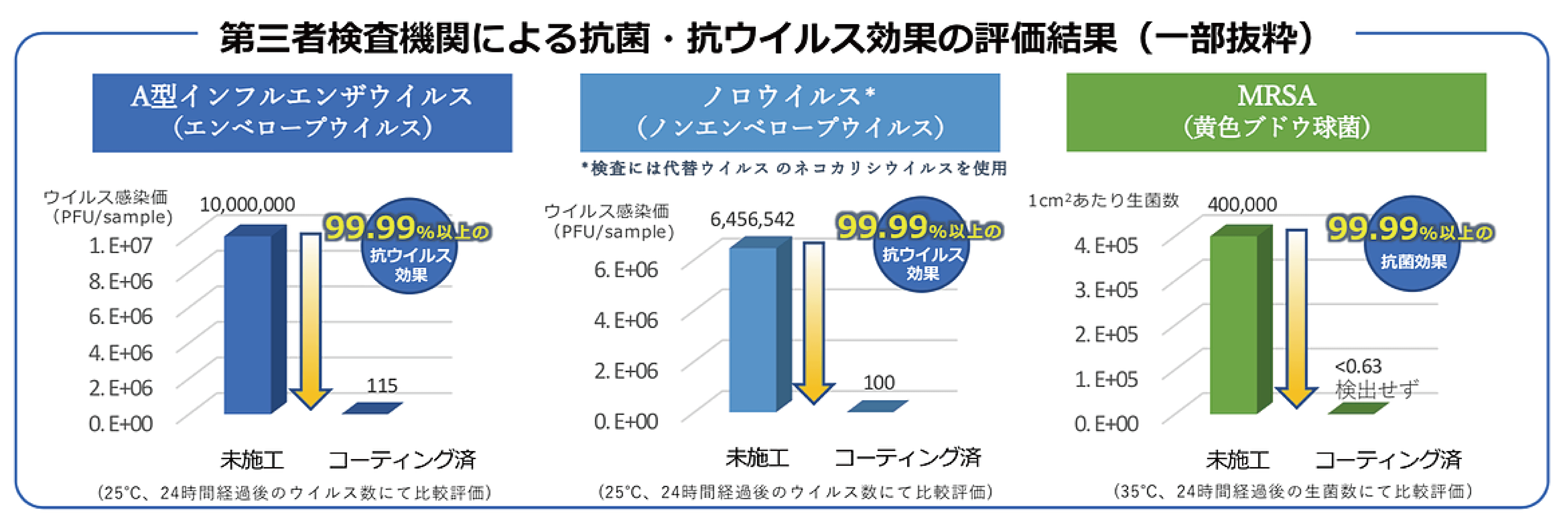 セラフ榎本が取り扱う「抗菌・抗ウイルスコーティング」とは、光触媒(酸化チタン)・銀(Ag)・プラチナ(Pt)の独自配合により菌・ウイルスを持続的(1年間)かつ強力に分解・不活化するコーティングです。臭いもなく、金属や布地への腐食性もありません。安心安全の日本製で人にも全く無害です。物理的に菌・ウイルスを分解・不活化するため、近年問題になっている薬剤による耐性菌を発生させる恐れがありません。