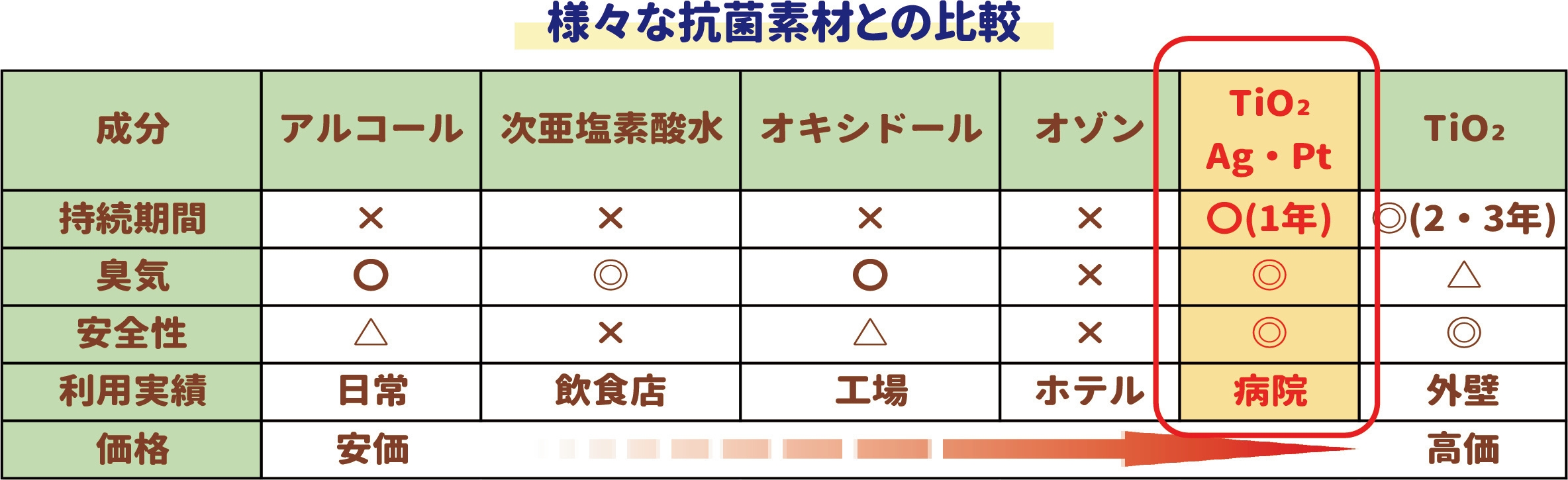 また、エタノールや次亜塩素酸スプレーは噴射の都度菌やウイルスを不活化しますが「噴射して揮発後、次に噴射するまでの間」には効果がありません。つまり、頻繁な噴霧を要し、維持するためには膨大な手間と人件費を要します。しかし、持続性抗菌・抗ウイルスコーティングは除菌の持続時間が1年と長く、噴射回数が少なくできるため、長期的にみると安価です。
